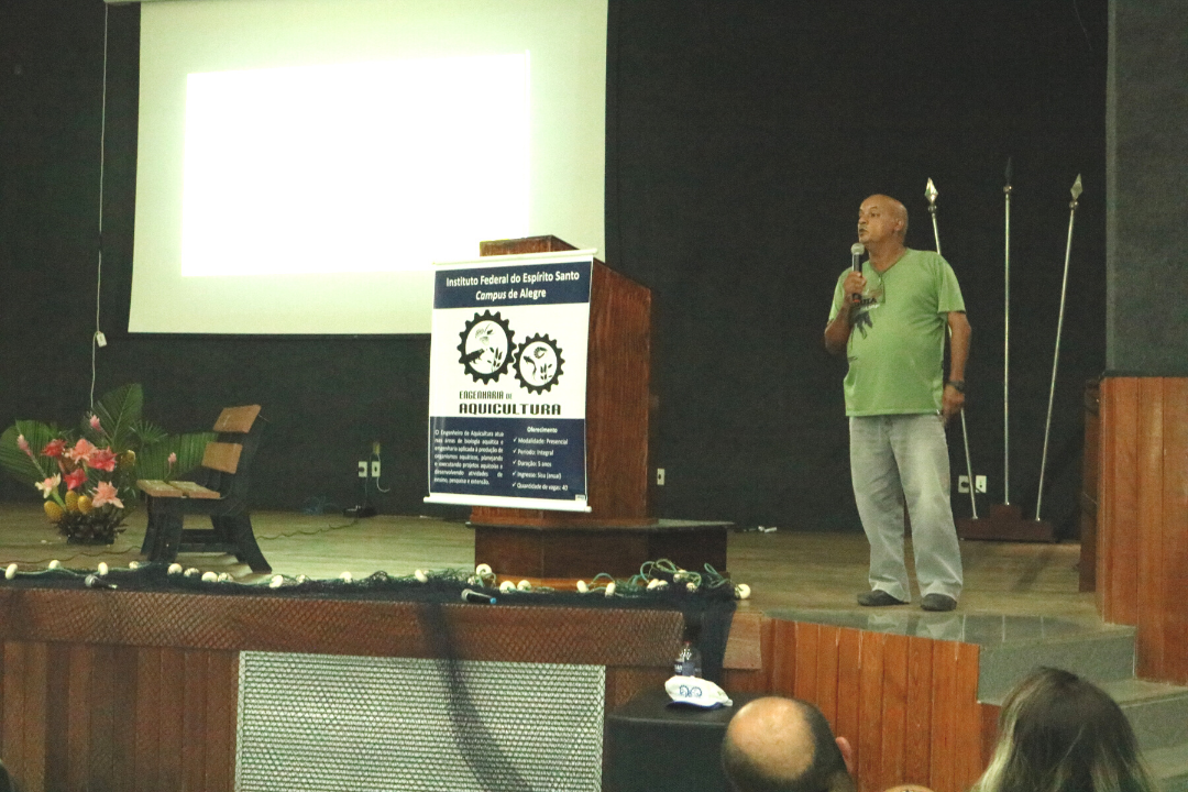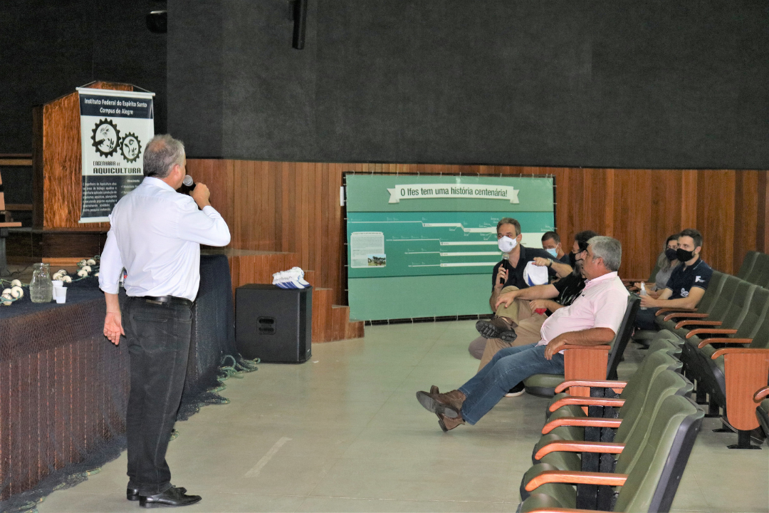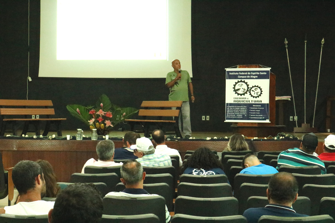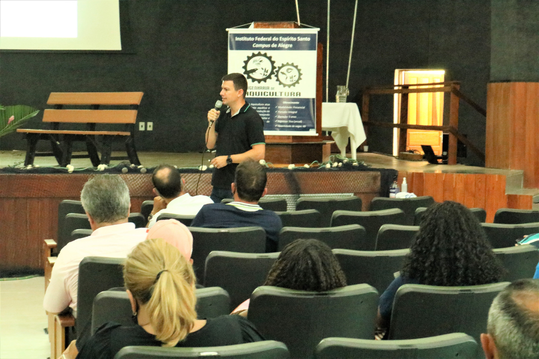 Na terça-feira (15/12) foi realizado o IV Encontro de Aquicultura do Ifes. Com o público majoritariamente de produtoras e produtores rurais, o encontro reuniu aproximadamente 70 participantes, contando com secretários(as) municipais de agricultura, representantes do Incaper, do IDAF, de cooperativas e associações, empresários, professores, pesquisadores, estudantes e técnicos da área de aquicultura. Os participantes vieram de ao menos nove municípios do ES.